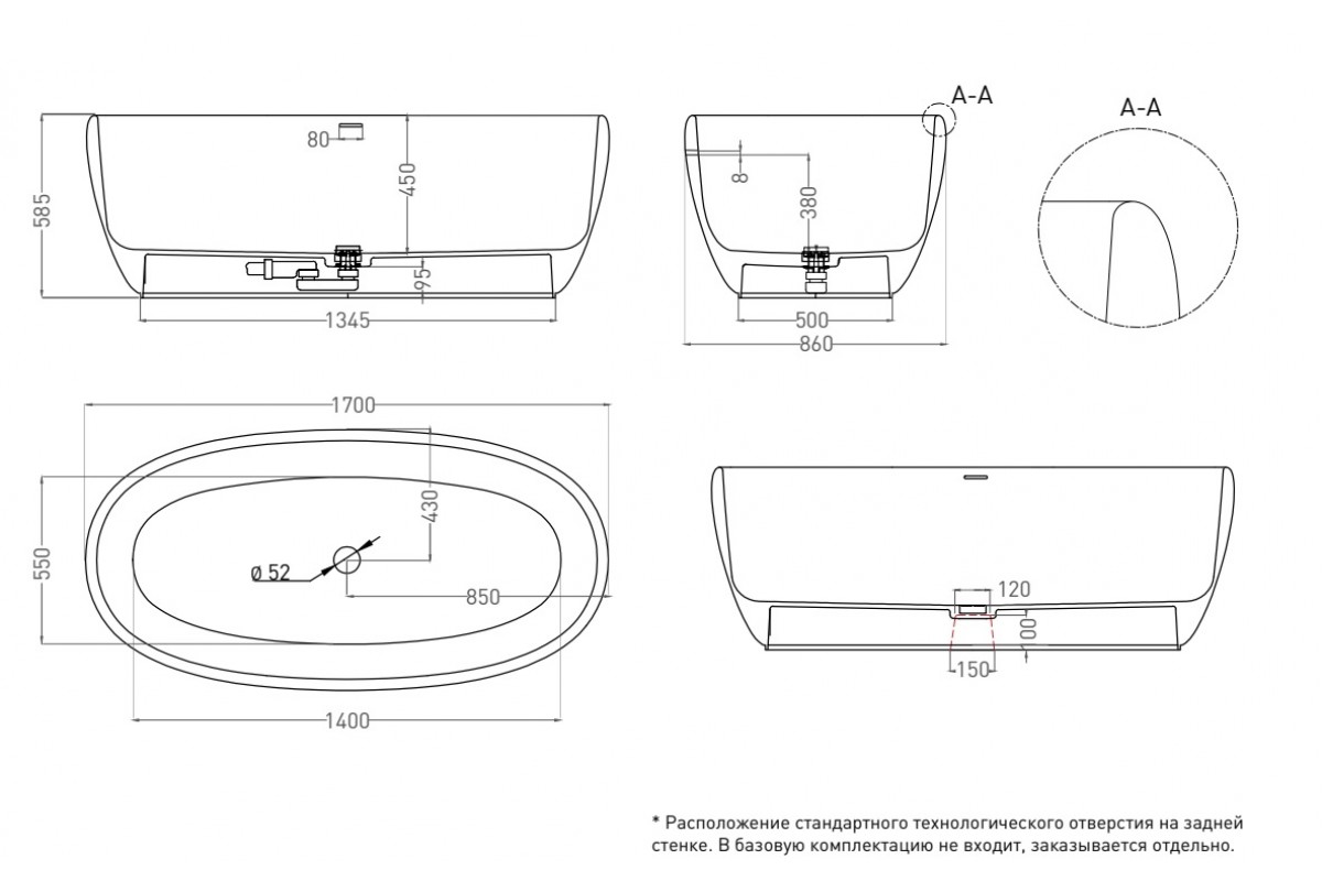 Ванна из искусственного камня Salini Luce S-Stone 170х85 белый матовый 100121M