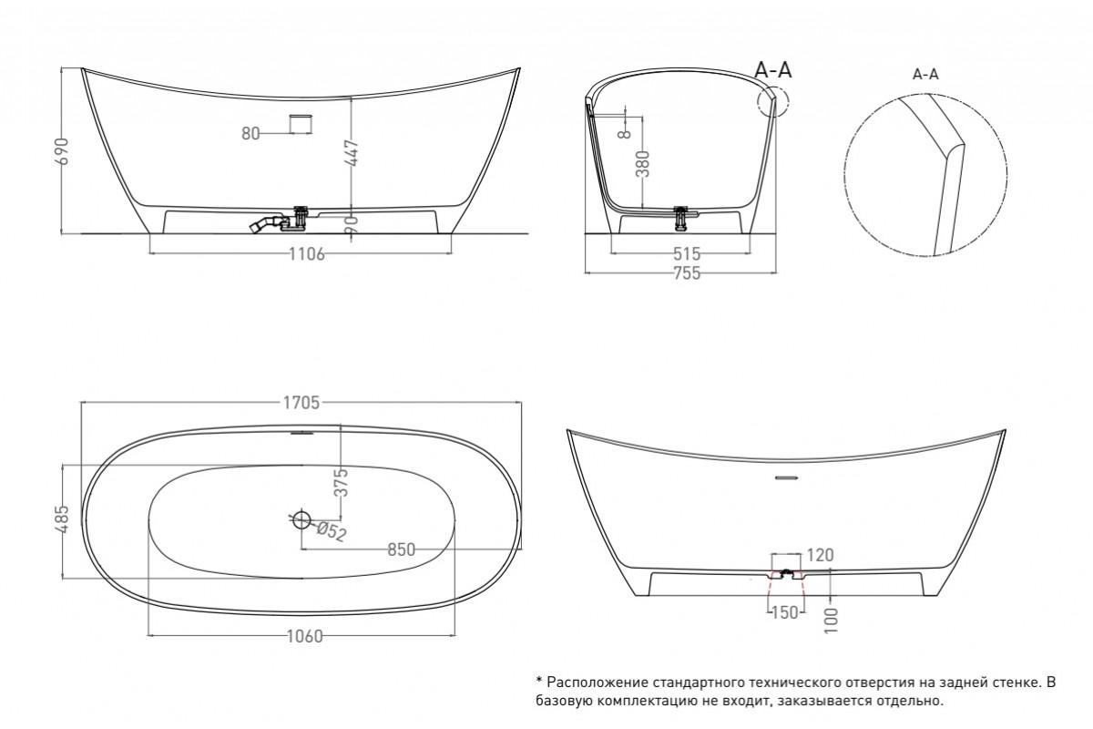 Ванна из искусственного камня Salini Noemi S-Sense 170х75 белый глянцевый 101712G