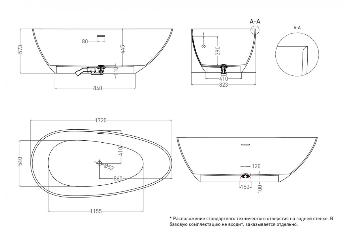 Ванна из искусственного камня Salini Paola In Classic S-Stone 172х82 матовый, покраска по RAL полностью 101612SMF