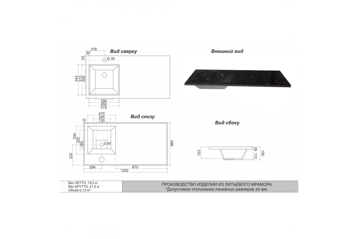 Раковина над стиральной машиной Uperwood Марсал 120 см, левая, черный мрамор 291120412