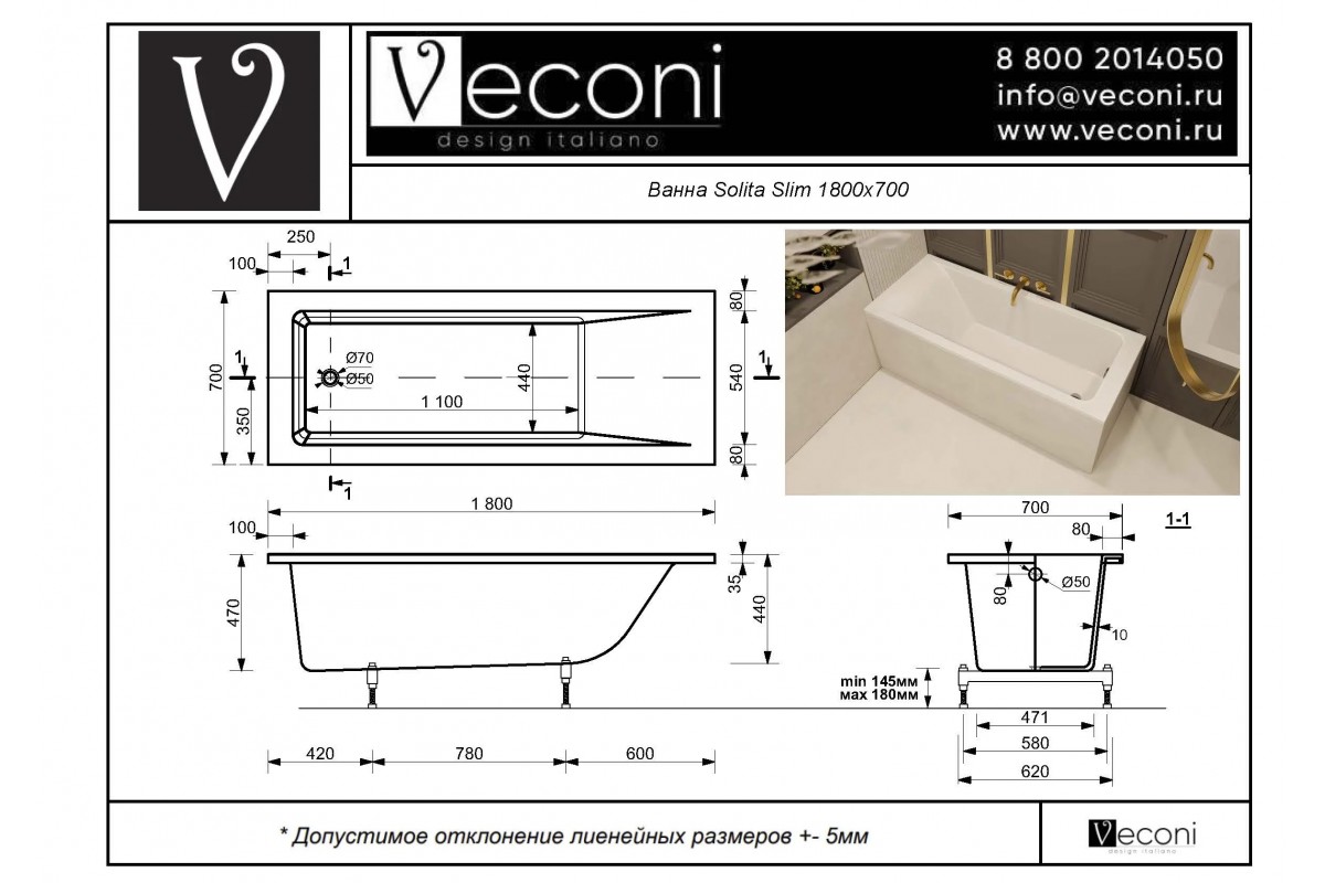 Ванна из искусственного камня Veconi Solita Slim 180х70 белый/глянцевый SLTSLIM18070 (109 кг)