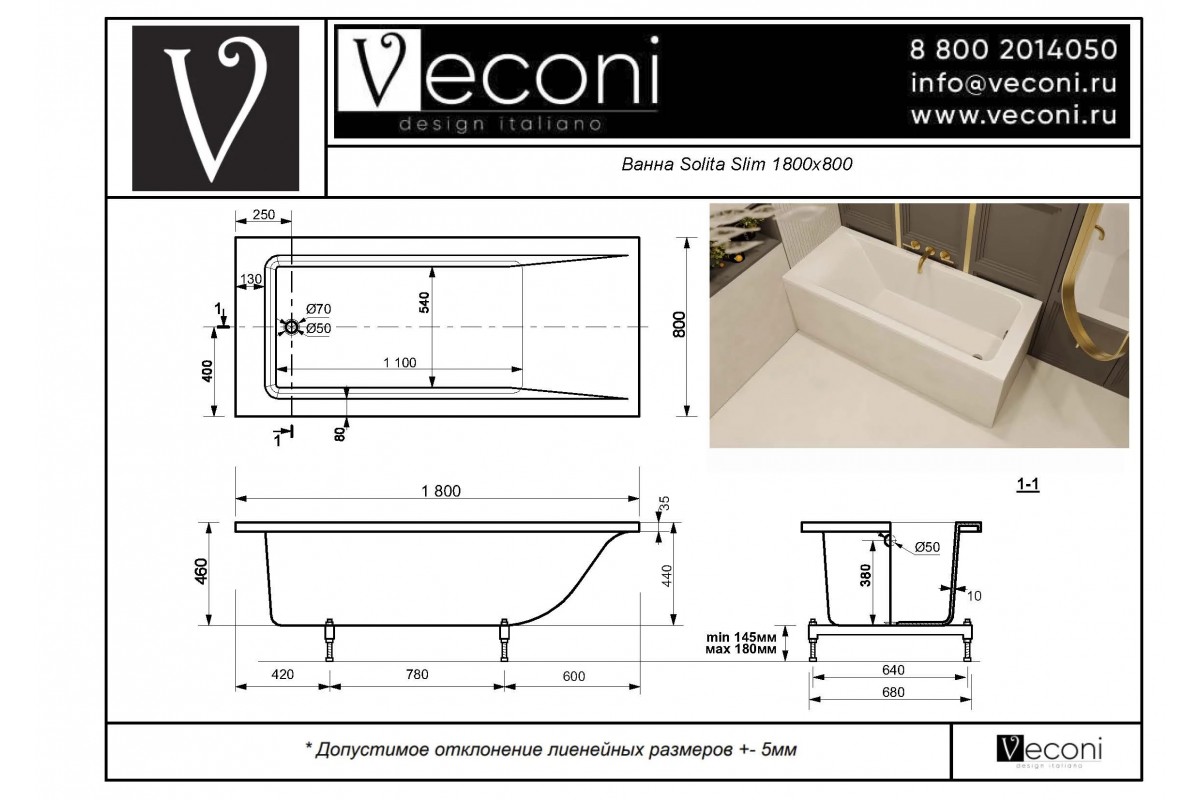 Ванна из искусственного камня Veconi Solita Slim 180х80 белый/глянцевый SLTSLIM18080 (109 кг)