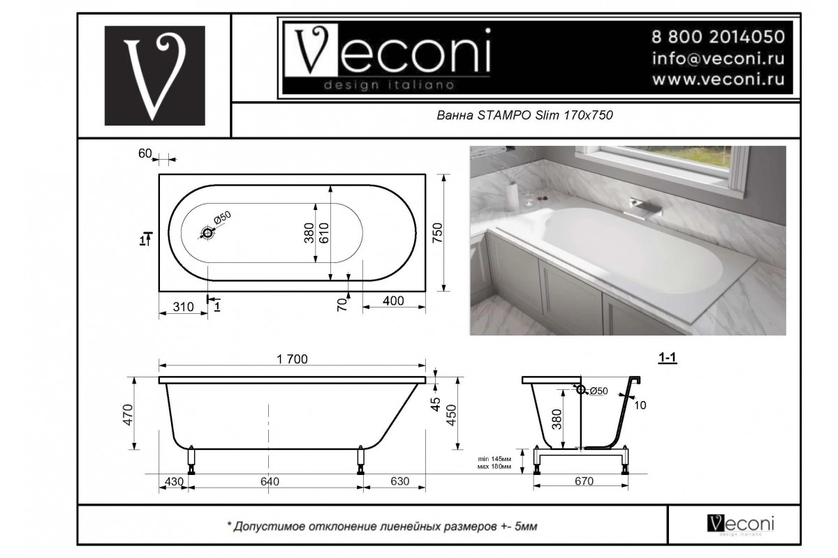 Ванна из искусственного камня Veconi Stampo Slim 170х75 белый/глянцевый STMSLIM17075 (94 кг)
